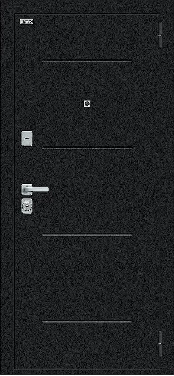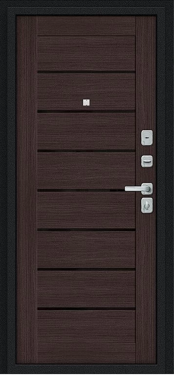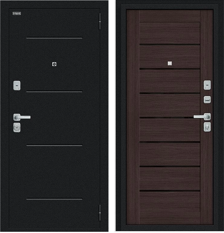 Надежная входная Дверь Браво Техно/BChrome Букле черное/Wenge Melinga премиум класса по цене 35 635 руб. Большая толщина стали защитит от проникновения в ваш дом, квартиру или коттедж. Используется очень качественная фурнитура: замки, цилиндры, ручки, защелки. Покрытие и отделка двери изготовлено под внимательным контролем производителя. Дверь имеет долгий срок службы и гарантию.